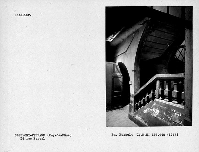 La ville de Clermont-Ferrand possède un certain nombre d'immeubles contenant des cages d'escalier à plusieurs volées, rampe sur rampe à balustres. L'escalier de cet immeuble joint deux corps d'habitation et se situe entre deux cours intérieures. L'escalier est formé de cinq montées à retour direct, séparées par des paliers intermédiaires. Sur l'extérieur, sa cage est fermée, d'un côté, par un mur plein dans lequel sont engagées les marches, tandis qu'elle s'ouvre, de l'autre, au-dessus d'une rangée de balustres, par deux baies dont l'une en arc rampant supporte la montée du dessus. Du côté de l'intérieur, le mur est ajouré, à chaque palier, d'un arc rampant qui supporte une partie de la montée du dessus et le palier auquel elle aboutit. Dans la partie ajourée, sous ces ouvertures, chaque montée est limitée par une rangée de balustres quadrangulaires. Cinq montées successives ainsi disposées desservent trois étages.