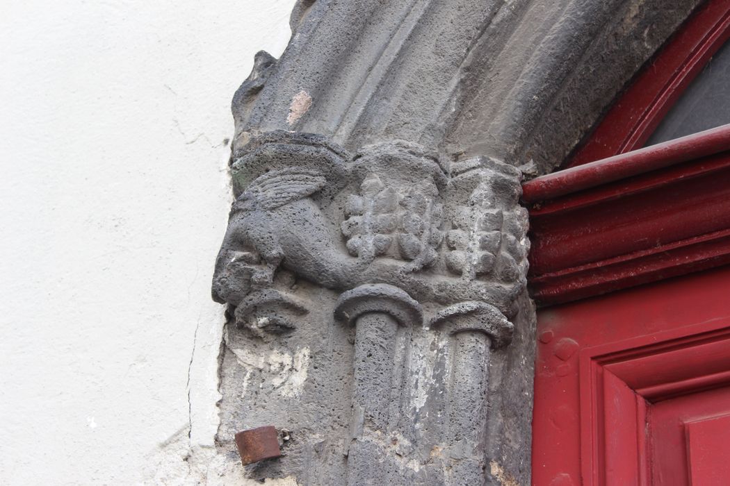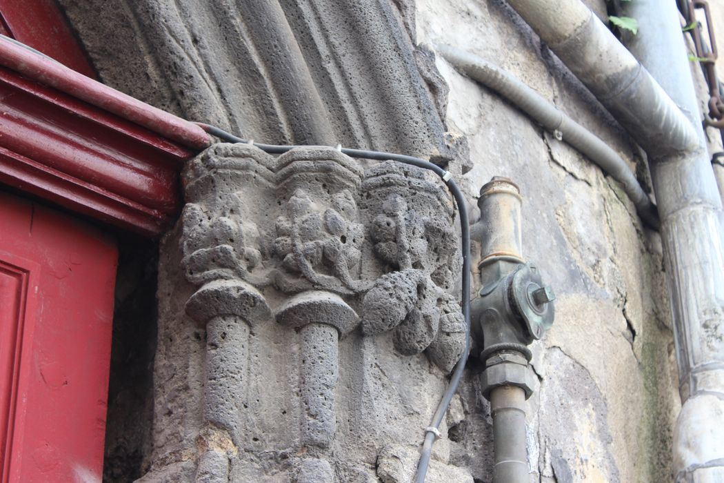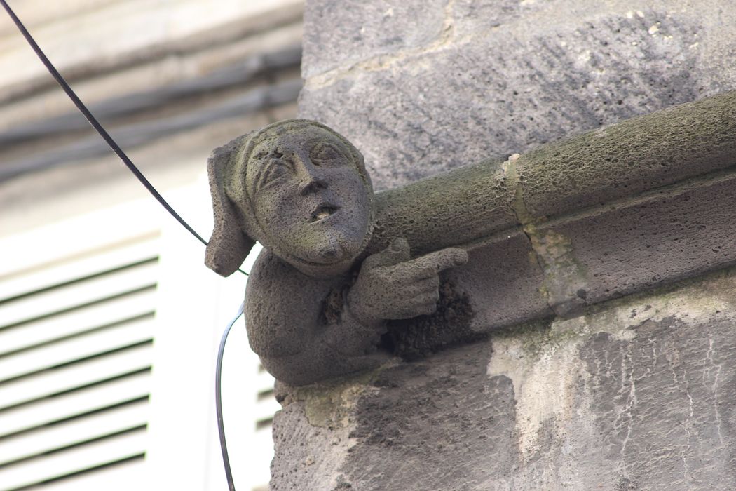 Suite au tremblement de terre de 1490, Clermont n'a pas conservé un tissu urbain médiéval complet. Il reste quelques témoins épars, comme cette façade probablement du 14e siècle, présentant deux têtes sculptées aux extrémités du bandeau qui marque le premier étage. Le corps de logis a conservé des éléments anciens, dont une porte palière avec tympan et chapiteaux sculptés. La maison a été remaniée au 18e (escalier) puis au 19e siècle (percements en façade). La cage d'escalier abrite un escalier tournant à volées droites suspendues sur limon porteur, avec repos intermédiaire et palier à chaque étage. Les deux premières volées (premier étage) sont en pierre avec rampe d'appui en bois à balustres plats et départ en rouleau. Les étages supérieurs sont en bois avec retour de limon gauchi. Cet escalier est le seul de son genre à Clermont et peut être daté du 18e siècle d'après la forme des balustres en poire.