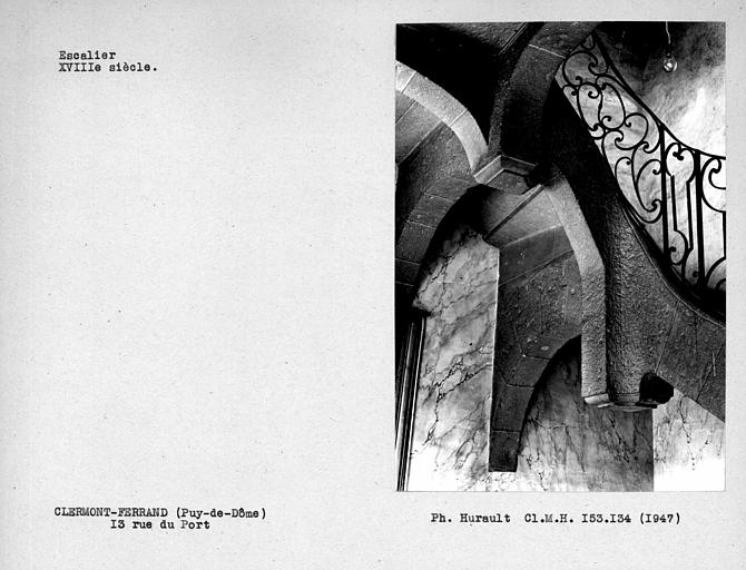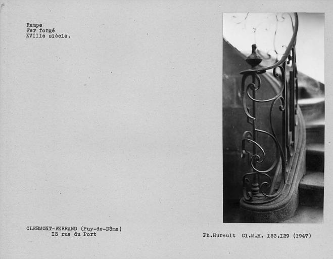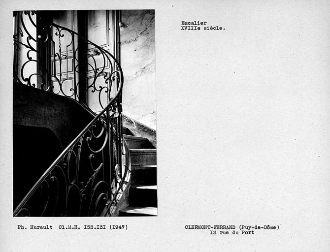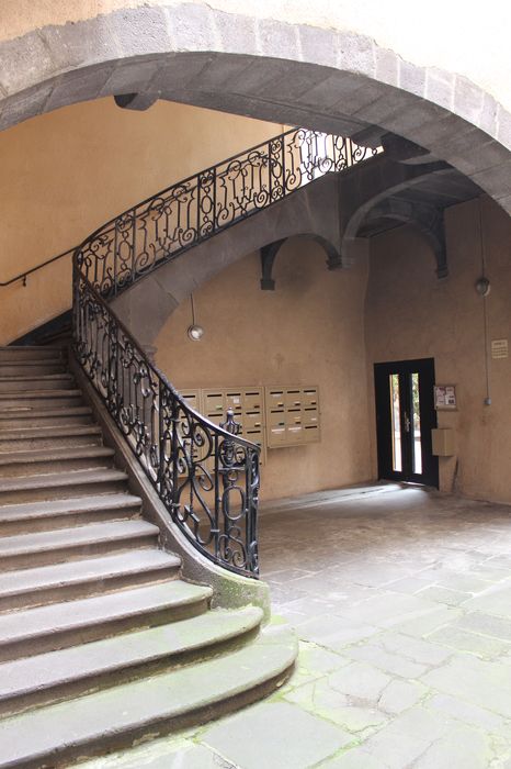 L'ancien hôtel de Reboul s'ouvre au rez-de-chaussée par une large porte d'entrée que ferment deux lourds vantaux ornés d'un décor sculpté Louis XV. Cette entrée donne accès à un couloir voûté qui s'ouvre, par un arc en cintre, sur une cage d'escalier. L'escalier se compose de deux montées droites avec un palier intermédiaire. Le limon de la deuxième montée est soutenu par un arc rampant, formant à sa partie supérieure, avec trois arcs supportant le palier du premier étage, une retombée pendante en porte-à-faux. La rampe en fer forgé décrit, à son départ, un enroulement en forme de spirale autour d'un axe perpendiculaire surmonté d'un motif ajouré. Cette rampe est formée alternativement de deux panneaux, l'un large, l'autre étroit. Ce dernier comporte un motif central ovale encadré de deux boules. Deux motifs sont disposés symétriquement au-dessus et en-dessous : un cercle et deux enroulements en C opposés. Les grands panneaux sont également formés d'enroulements en C alternant avec des éléments rectilignes, des cercles, demi-cercles, agrémentés de feuilles recourbées, le tout ordonné symétriquement par rapport à un motif central formé d'un fleuron épanoui dont une simple barre forme le pistil allongé. La parfaite symétrie de ce décor en fer forgé, sa régularité, les imperfections d'une technique encore maladroite indiquent qu'il s'agit d'une des premières oeuvres de l'atelier de ferronnerie qui a laissé nombre de témoignages à Clermont au 18e siècle. £Les vantaux des portes s'ouvrant sur les paliers sont ornés de moulures Louis XV.