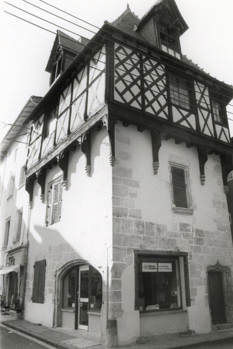Maison ayant probablement été édifiée au 15e siècle par un marchand tenant boutique au rez-de-chaussée, comme en témoigne une arcade en anse de panier, moulurée et à bases prismatiques. La partie supérieure en pan de bois servait de séchoir, selon un modèle autrefois très répandu dans le Livradois. La sablière porte six travées délimitées par des poteaux de remplissages et garnies d'entretoises et de décharges en croix-de-Saint-André sur deux niveaux. En bâtière, au-dessus de la lucarne éclairant les combles, un fronton triangulaire ajouré est orné de festons polylobés aux pointes ornées de trèfles. Cette maison a conservé l'essentiel de ses percements d'origine et présente une disposition assez répandue autrefois à Courpière : deux niveaux maçonnés et un étage à pan de bois.