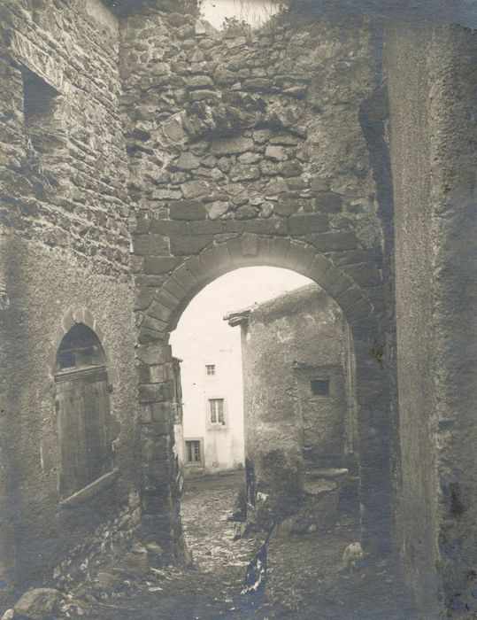 Une porte en arc plein cintre donne accès au château dans la ville, et conserve les traces de la voûte qui la précédait.