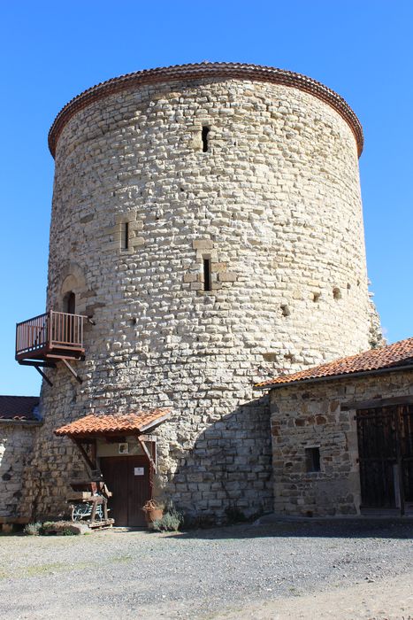 De l'enceinte castrale sont conservés d'importants éléments de muraille ainsi qu'une tour dont l'entrée est au premier étage selon les dispositions coutumières dans ce genre d'ouvrage défensif. Le donjon se trouve à l'angle nord-est et est le seul exemple de donjon de place-forte conservé dans la région, avec ceux de Montpeyroux et de La Sauvetat. L'ouvrage se présente comme une tour cylindrique dont la base est à plusieurs mètres au-dessus du sol. Un pont-levis ou une galerie mobile donnait accès à l'étage. Les têtes de poutres étaient reçues dans trois trous carrés encore apparents sous la base de la porte plein cintre, à tympan formé d'une seule pierre taillée et unie, soutenue par deux corbelets et posés légèrement en retrait. Le donjon a été découronné et rasé à hauteur du second étage. Les voûtes du rez-de-chaussée et du premier étage ont été démolies. Il ne reste que des vestiges de l'escalier primitif reliant le premier étage au couronnement. Le donjon est percé de petites ouvertures (archère, meurtrière).