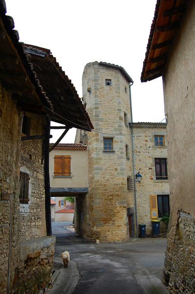Adossée à l'ancienne courtine se trouve une maison comportant une tourelle d'escalier polygonale du 15e siècle. Cette tour est située à l'emplacement de la porte ancienne fortifiée qui donnait accès à la forteresse, au côté nord-ouest. C'est une tourelle hexagonale à pans coupés, renfermant un escalier à vis. La face ouest est flanquée à hauteur du premier étage d'une petite construction soutenue par des poutres de bois, au-dessus d'un passage donnant accès à la place de l'Eglise. Ce passage était primitivement voûté en plein cintre ; cette voûte supportait une construction assez élevée qui a été démolie, dont il reste notamment les vestiges d'une cheminée Renaissance.