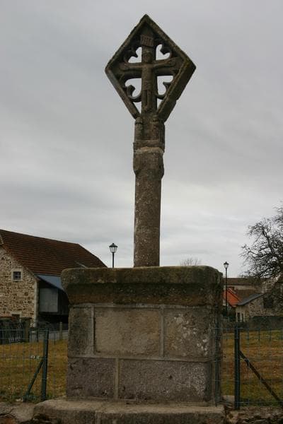 Croix de lave du 15e siècle qui se compose d'un fût cylindrique surmonté d'une dalle ajourée en forme de losange constituant la tête de cet édicule. Dans cette dalle sont découpées les branches de la croix et, entre elles, des redents tangents aux côtés du losange. Sur une face est le Christ en croix ; sur l'autre la Vierge et l'Enfant avec deux petits anges. Entre la tête et le fût se trouve une partie rectangulaire, laquelle est ornée, sur ses quatre faces, de petits personnages en bas-relief.