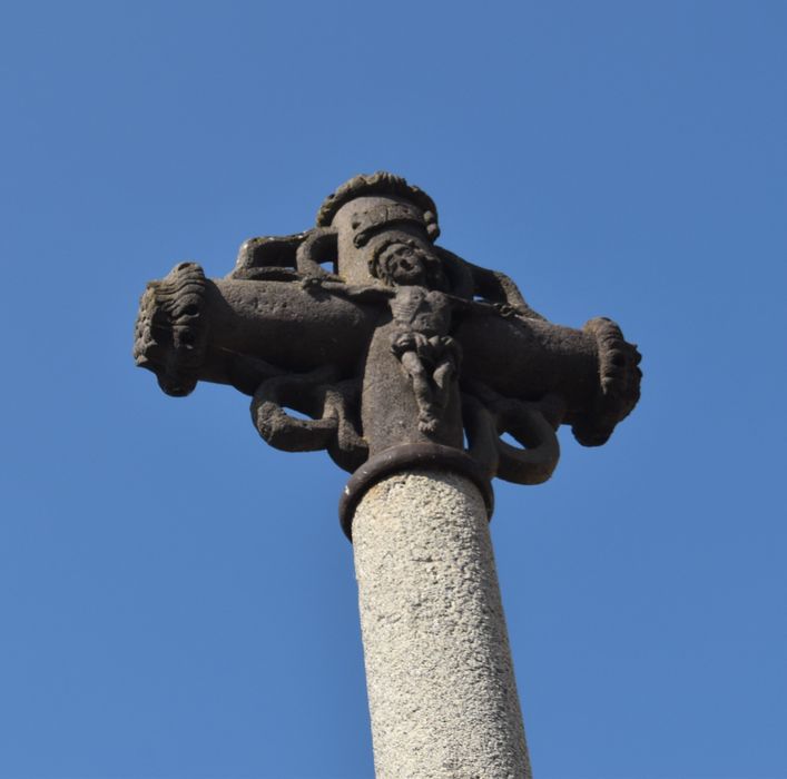Croix de chemin en pierre, du début du 16e siècle, portant d'un côté le Christ, de l'autre la Vierge à l'Enfant. Les extrémités sont ornées de fleurons et les croisées forment une rosace.
