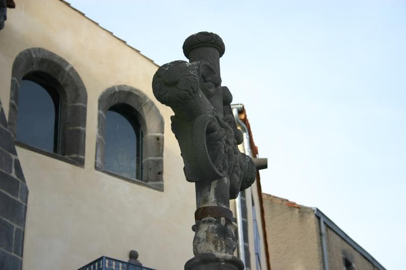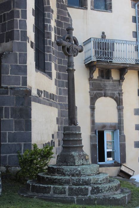 Croix du 16e siècle en lave de Volvic. Sur un piédestal octogonal et mouluré, part un fût cylindrique à la naissance duquel est un écu dont les armes ont été grattées. La croix posée sur ce fût, au-dessus d'une moulure, a ses quatre branches terminées par des feuillages et sont reliées entre elles par des volutes formant cercle autour d'un Christ au pied duquel sont la Vierge et Saint-Jean.