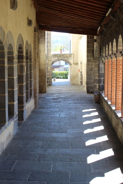 Ce cloître fait partie des vestiges de l'ancien prieuré des religieuses bénédictines de Marsat qui relevait de l'abbaye de Mozac. Il se compose de deux faces latérales. Il formait autrefois un quadrilatère complet, mais les faces sud et ouest ont disparu. Il est voûté d'arêtes. Chaque compartiment est éclairé par une baie géminée dont les arcs sont en plein cintre. Ceux-ci reposent sur des doubles colonnettes formées de fûts cylindriques couronnés par des chapiteaux à crochets. Les bases des colonnettes sont ornées de griffes. Le cloître peut être daté de la première moitié du 13e siècle.