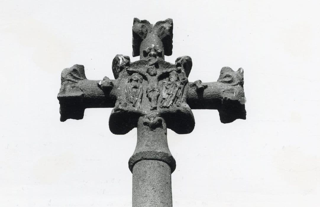 Croix élevée en brodure d'un chemin carrossable. Au centre de la croix est posé un nimbe circulaire chargé sur l'extérieur de quatre feuilles coudées alternant avec quatre fleurons sculptés en bas-relief sur le montant et les bras. A l'intérieur du nimbe sont sculptées une Crucifixion et une Vierge couronnée tenant l'Enfant. Le Christ crucifié est entouré de la Vierge et d'un saint évêque tenant la crosse et bénissant d'une main.