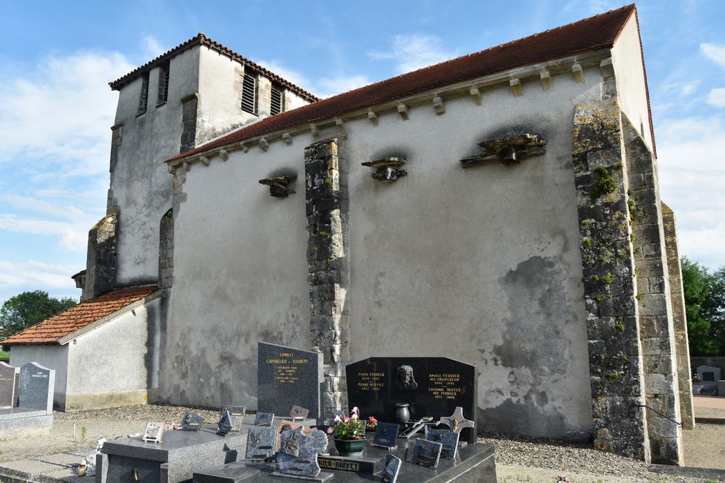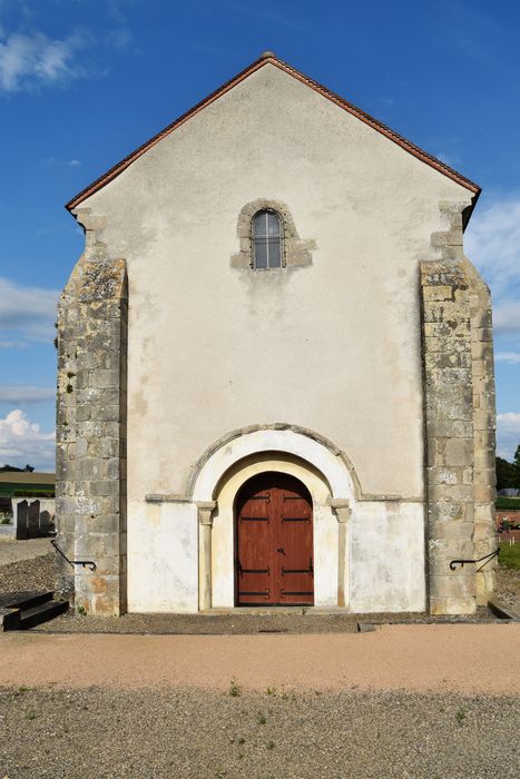 Eglise formée d'une nef de deux travées, d'un transept que surmonte le clocher, et d'un choeur en forme d'abside semi-circulaire. La voûte de la nef est fortement affaissée, accident devant remonter à l'époque de la construction. Il y a été remédié en établissant des sortes de cintres permanent en charpente qui servent aussi de tirants, fixés extérieurement par d'énormes clés en bois. L'abside est voûtée en cul-de-four et possède, sur son pourtour, un décor de cinq arcatures dont les colonnettes présentent des chapiteaux aux corbeilles sculptées de feuillages.