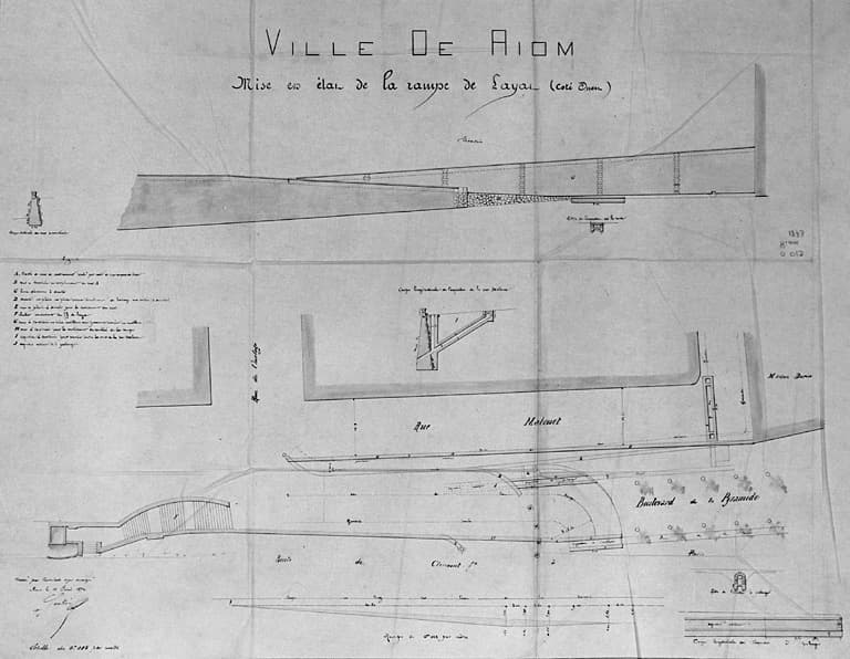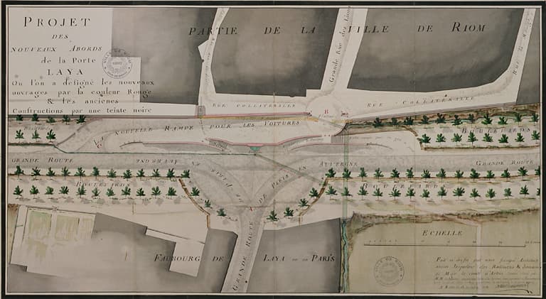 En 1777, les officiers municipaux décidèrent de faire élever un ouvrage à l'emplacement de la porte de Layat des anciens remparts. En 1779, les remparts sont démolis. L'architecte Attiret de Mannevil est chargé d'établir les plans et de surveiller les travaux. Les pierres issues de la destruction des remparts sont réutilisées dans la nouvelle construction dont les travaux durent quatre ans. Trois murs de soutènement, un central et deux latéraux, constituent l'ouvrage. L'escalier comprend deux volées doubles : une première volée double à montées parallèles ; une deuxième volée double à montées divergentes, séparée de la première par deux repos accostant la fontaine située au centre de la composition.