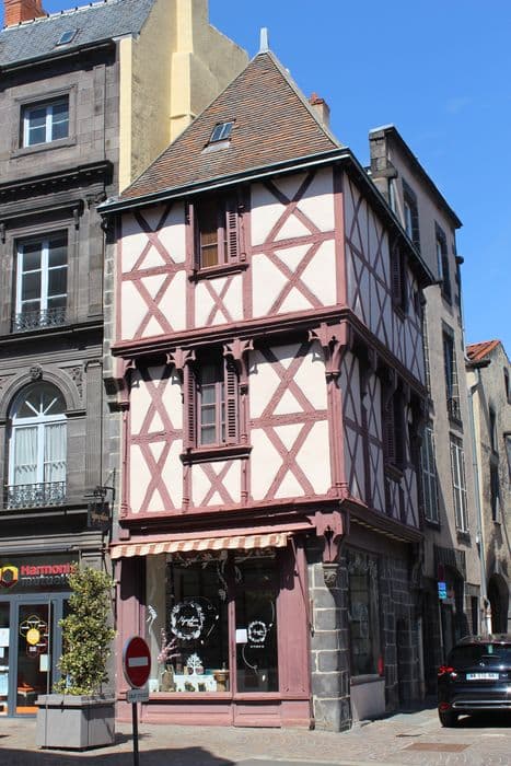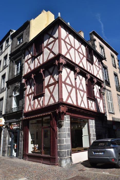 A l'exception du soubassement et du mur du fond, maison construite en bois, la seule de ce type semblant subsister à Riom. L'édifice se compose de deux étages, le second étant bâti en léger encorbellement sur le premier. Cet encorbellement est soutenu par des arcatures à redents qui l'ornent sur tout son pourtour. Dans les parties basses en pierre se remarquent de curieuses têtes formant cul-de-lampe. £Cette maison passe pour avoir appartenu à Jean Mazuer, jurisconsul de Riom du 15e siècle.