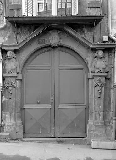 Ancien hôtel Valette de Rochevend, la maison s'ouvre par une porte cochère ornée de deux cariatides. Cette porte est formée d'un arc en plein cintre surmonté d'un fronton triangulaire. La clef du cintre présente un cartouche qui portait des armoiries aujourd'hui effacées. Sur un socle entouré de draperies, qui naît à la hauteur du cintre de l'ouverture et dont le prolongement en saillie s'applique sur le pied droit de la porte, se dresse un buste humain, d'un côté homme, de l'autre femme. Les bustes sont nus et la tête coiffée d'un linge. Celle-ci supporte le départ du fronton triangulaire qui surmonte le cintre de la porte.