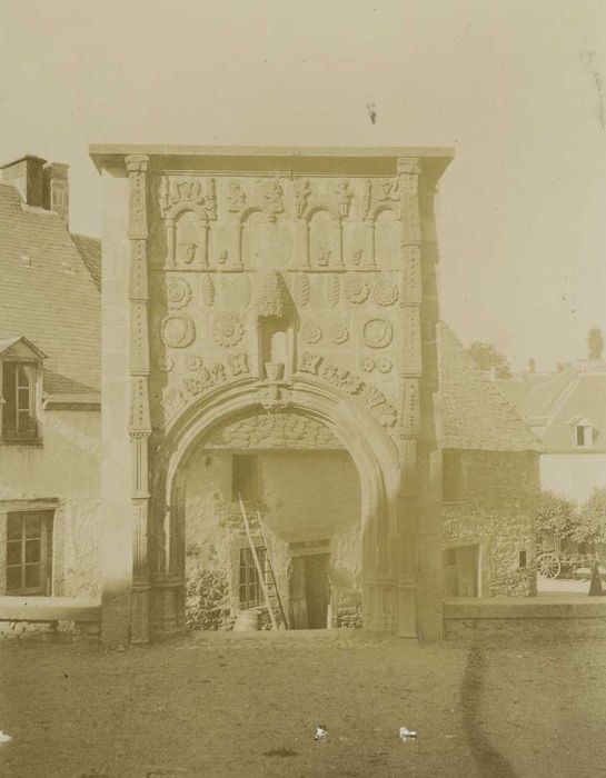 Lors de la construction de l'église actuelle, en 1873, le portail de l'ancienne église du 16e siècle a été réédifié sur la place du village. D'autres sources indiquent qu'il pourrait s'agir d'un élément d'un château démoli. Il allie certaines formes encore gothiques au répertoire de la Renaissance. Y figure le blason de Jean de Lévis, seingeur de Saint-Sauves à partir de 1595.£Ce portail, surmonté d'un mur formé du remploi de différentes sculptures, mesure 1, 90 mètres. Au-dessus du cordon d'archivolte mouluré d'un tore chargé d'un listel, qui surmonte l'arc en anse de panier, sont disposées des sculptures représentant des feuillages. A la clef de l'arc est sculpté un petit personnage nu, de part et d'autre de la tête duquel sont figurées des sortes de petites ailes. Ce personnage sert de culot à la tablette d'une niche dont les montants sont formés de colonnettes supportant le dais en forme de pyramide dont les faces ont un décor en bas-relief de masques, feuilles de marronnier, corolles, croix. Un socle sculpté d'un masque garnit la partie inférieure de cette niche. De part et d'autre des piédroits sont engagés de petits pilastres rectangulaires formés d'éléments superposés séparés entre eux par des bagues saillantes moulurées. Le mur limité par ces pilastres, l'ouverture du portail et la corniche supérieure, sont formés d'un assemblage de sculptures en bas-relief disposées selon deux registres. La moitié inférieure présente un décor formé de l'alternance ou de la succession de dix corolles de différentes tailles, de deux écus dans un cadre circulaire formé d'une tresse, et de quatre feuilles de fougère. Le registre supérieur est décoré de quatre arcatures à colonnettes dont les chapiteaux reçoivent les arcs surbaissés au décor sculpté en creux. Quatre masques humains sont disposés sous ces arcatures ou entre elles. Au-dessus figurent des personnages dans différentes attitudes, masques et motifs ornementaux.