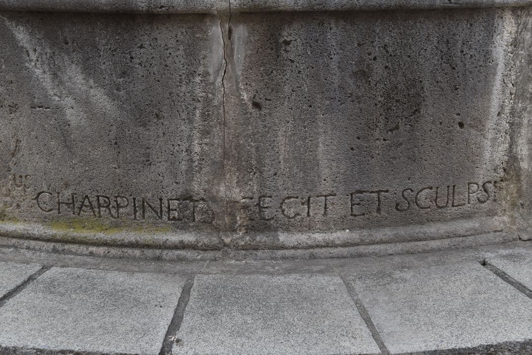 Fontaine du 16e siècle comprenant un bassin circulaire à rebord mouluré saillant sous laquelle est gravée en creux d'une inscription latine. Un boudin se trouve sous cette inscription. Au centre de ce bassin circulaire formé par de larges dalles d'andésite se trouve un édicule dont la base carrée arrivant à hauteur des rebords du bassin supporte un fût circulaire sur lequel est posé un vaste récipient clos en pierre, ovale, dont la partie inférieure comporte, sculptés en relief quatre mascarons par les gueules desquels l'eau coule dans le bassin. Trois moulures saillantes à profil de boudin entre lesquelles est également gravée une inscription, se trouvent au-dessus des mascarons.