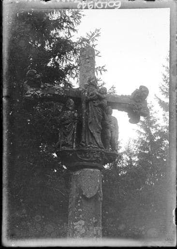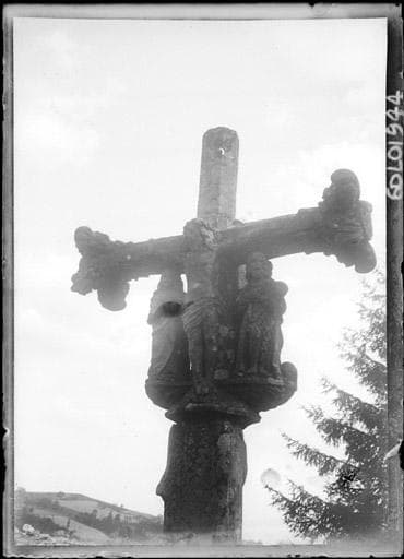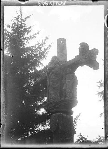 Croix du 16e siècle replacée sur un soubassement moderne. Elle se compose d'un socle mouluré, d'un fût flanqué de petits contreforts et de la croix proprement dite, à section prismatique et choux frisés aux extrémités des bras. Le Christ crucifié occupe une face ; la Vierge mère se trouve sur l'autre. Entre eux et au même niveau sont quatre personnages placés sous les bras de la croix. Chacun d'eux, ainsi que la Vierge, repose sur un cul de lampe spécial. Au-dessous de la Vierge est un écusson.