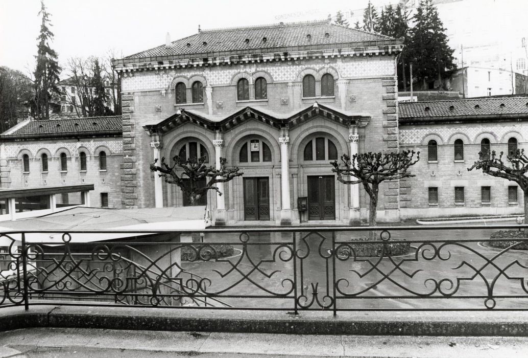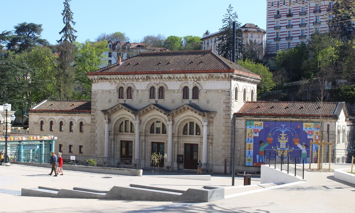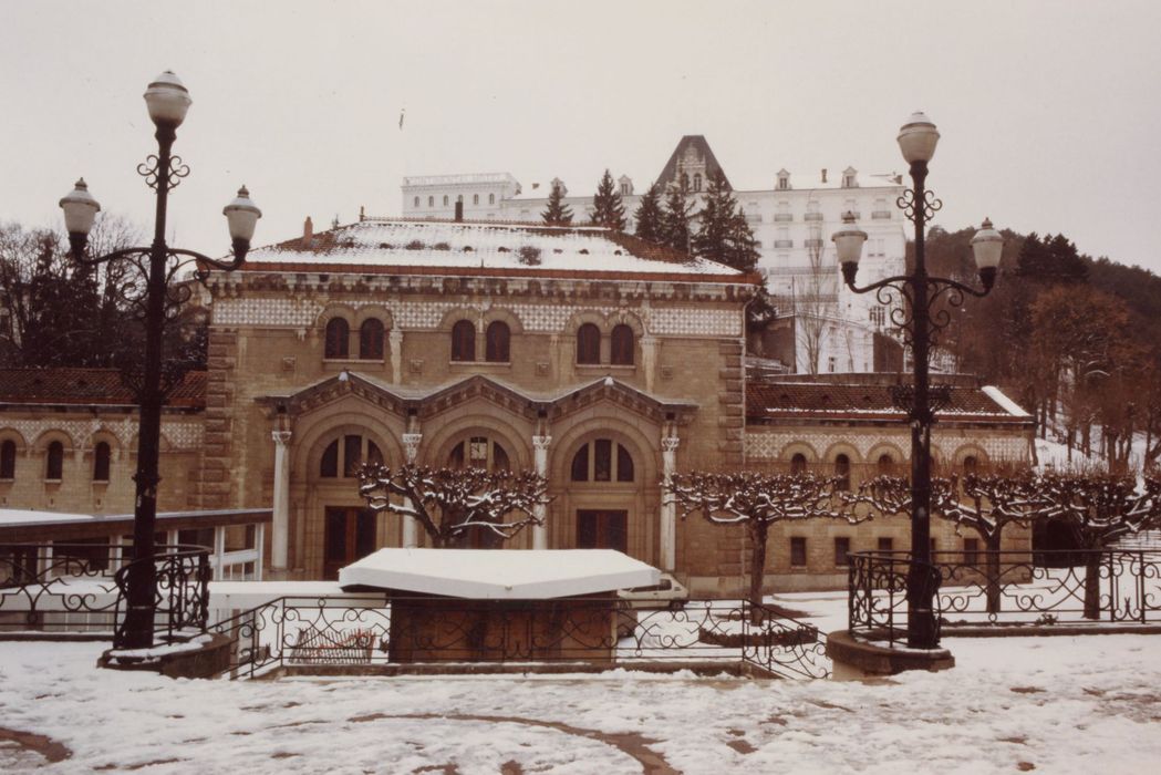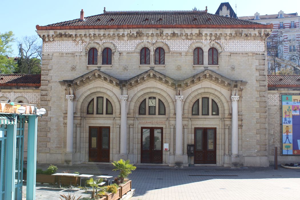 Construit au début du 20e siècle dans un style romano-auvergnat mêlé à des réminiscences antiques, l'établissement thermal apparaît comme un édifice éclectique de grande qualité. La richesse de son décor intérieur, en faïence polychrome, stuc et marbre est particulièrement remarquable. Les grands thermes s'adossent à la montagne qui fut creusée pour permettre l'implantation du bâtiment à l'endroit où jaillissent les sources d'eau minérale chaude destinées à alimenter les bains. Construit par l'architecte Chaussemiche, le bâtiment de plan rectangulaire, est formé de quatre corps entourant un atrium couvert d'une verrière. La façade principale comporte un avant-corps central abritant le vestibule d'entrée et un grand hall d'accueil promenoir. Ce pavillon central est accosté de deux ailes latérales de même niveau que les ailes en retour. Ces ailes, qui dessinent un carré autour de l'atrium, abritent sur deux niveaux les différents vestiaires et cabines de soins. Deux escaliers symétriques, situés à chaque extrémité du grand hall, desservent les ailes latérales. L'essentiel du décor architectural extérieur est concentré sur la façade principale nord. Les sols sont en mosaïques et carreaux de grès. Les murs sont revêtus de faïences polychromes de Boulenger (céramiste). Les portes du hall sont ornées de vitraux à décor non figuratif. Chapiteaux et ornements ont été sculptés en stuc et sont dus à A. Octobre.