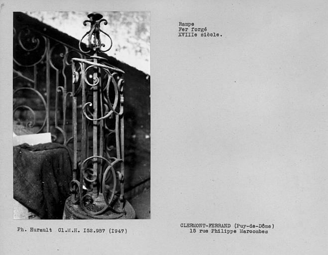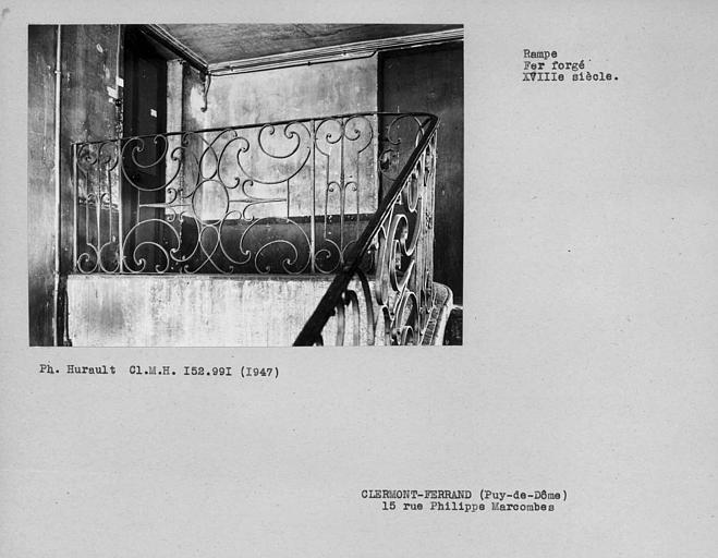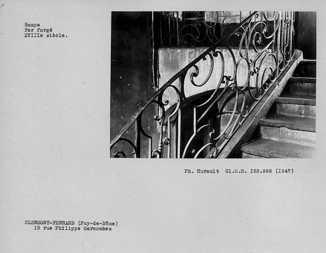Cet immeuble, qui présente par ailleurs peu d'intérêt architectural, abrite un bel escalier à rampe en fer forgé. A chaque étage, se trouve un palier principal reposant sur une voûte d'arêtes ornée à sa partie supérieure d'un motif décoratif en relief (fleurettes et collerettes de coquilles). Au départ, la rampe en fer forgé s'enroule autour d'une barre centrale surmontée d'un motif ouvragé. De ce départ jusqu'au palier du troisième étage, la rampe est formée de deux motifs qui se répètent alternativement. Le motif principal asymétrique est formé d'enroulements, courbes, entrelacs, de chaque côté d'un axe horizontal et autour d'un motif central en forme de cercle. Il se répète à chaque palier, en conservant sa forme droite. Un panneau étroit dont les enroulements sont symétriques par rapport à un axe vertical, sépare chacun de ces motifs principaux. Les enroulements de panneau central de la rampe au palier du troisième étage rappellent ceux du motif principal répété sur toute la course de l'escalier, mais avec une parfaite symétrie.