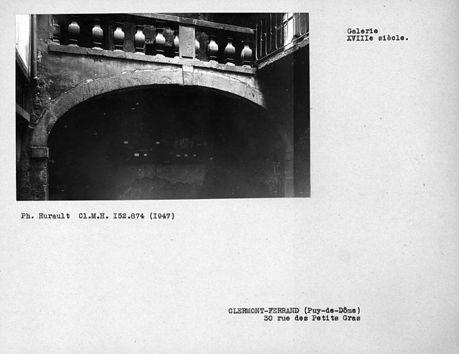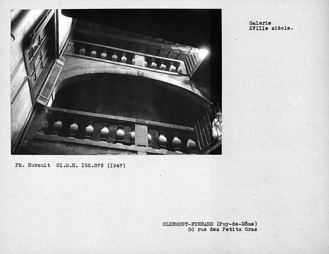 Immeuble daté de 1629 avec une cour fermée au fond de laquelle se trouve un escalier à mur noyau dont chaque palier est ouvert en loggia sur cour. Cette cour à galeries ouvertes est caractéristique du Clermont du 17e siècle. Chaque loggia est délimitée par une arcade surbaissée appareillée à clef et imposte saillante, sur laquelle repose une balustrade. Une table pleine dressée au droit de la clef centrale délimite la balustrade en deux. Chaque balustre carrée en poire comporte une panse galbée en tore à profil segmentaire. Ce dessin original se démarque des modèles clermontois habituels, qui sont droits.
