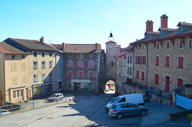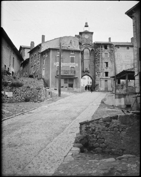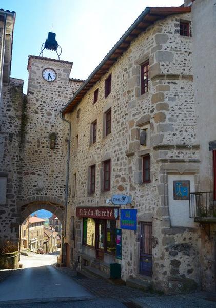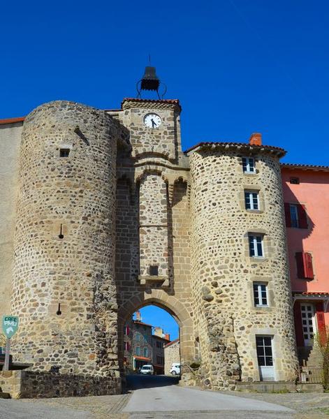 Ancienne porte d'entrée fortifiée de la première enceinte du château d'Allègre. Porte flanquée de deux tours. Porte ogivale surmontée de mâchicoulis et, au 19e siècle, de l'horloge publique.