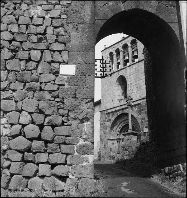 La poterne marquant l'entrée dans le rempart fermant le village primitif, correspondant à la première enceinte du château, a pu être construite au 11e siècle. L'ouvrage porte une plaque de marbre avec l'inscription suivante : "Portail féodal construit en 1066". L'élément central de cette poterne est composé d'une haute voussure en berceau légèrement brisé portant une petite salle ouverte sur l'intérieur par une fenêtre à meneau. Un arc de décharge est disposé sur les deux faces. A l'étage supérieur sous combles, une fenestrelle ouvre sur l'extérieur, mais peut avoir été rajoutée postérieurement, lors d'une surélévation. Une différence d'appareillage existe entre le premier et le deuxième étage, sans doute rajouté au 14e ou 15e siècle. Cette voussure est épaulée de deux contreforts importants.