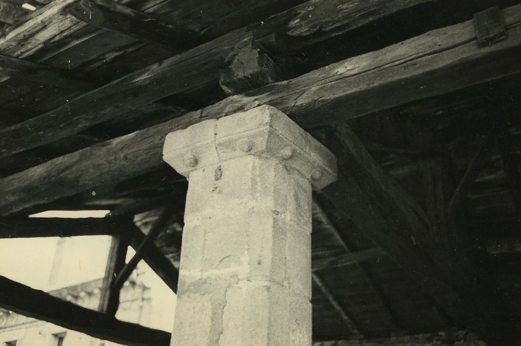 Foires annuelles créées en 1412 par H. de Montmorin. Edifice du 12e ou 13e siècle, couvert d'une charpente et poutres sur une seule travée dans sa largeur, soutenu par un mur dans sa partie postérieure qui surplombe un chemin descendant vers la basse ville. La face principale sur la rue d'arrivée est portée par des piliers reliés par une banquette. Ils portent un chanfrein sur leurs angles. Des tailloirs simples à chanfrein les couronnent. L'un d'eux est orné de billettes, rencontrées d'ordinaire sur des édifices du 12e siècle. Un mascaron est apparent à deux mètres de hauteur de la travée d'entrée.