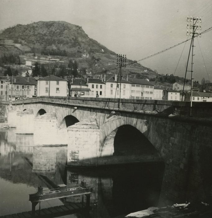 L'appareil soigné et les éperons restants permettraient de dater ce pont du 14e siècle. A demi ruiné depuis le 18e siècle lors de la construction du nouveau pont. En sont conservées deux piles, ainsi que les deux maisons de péage qui en marquent l'entrée sur la rive droite.