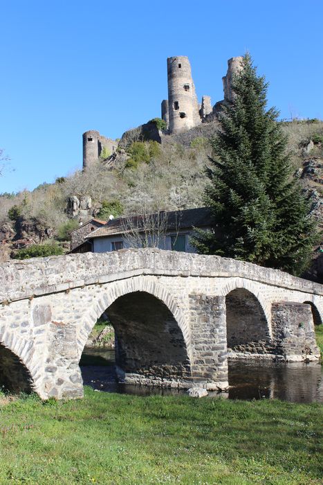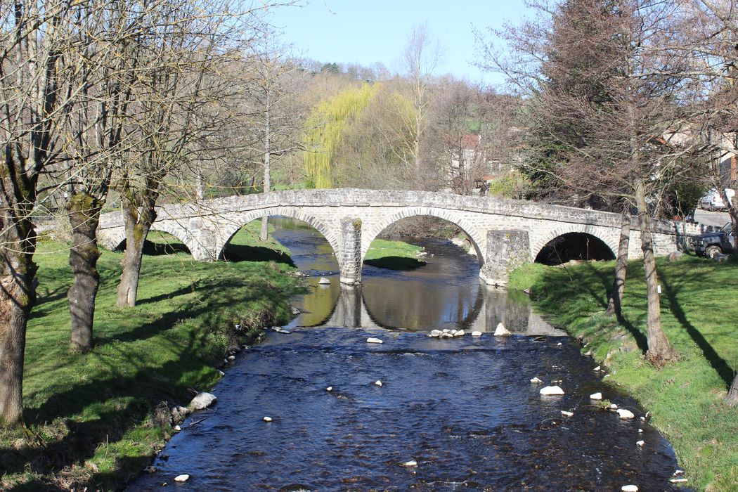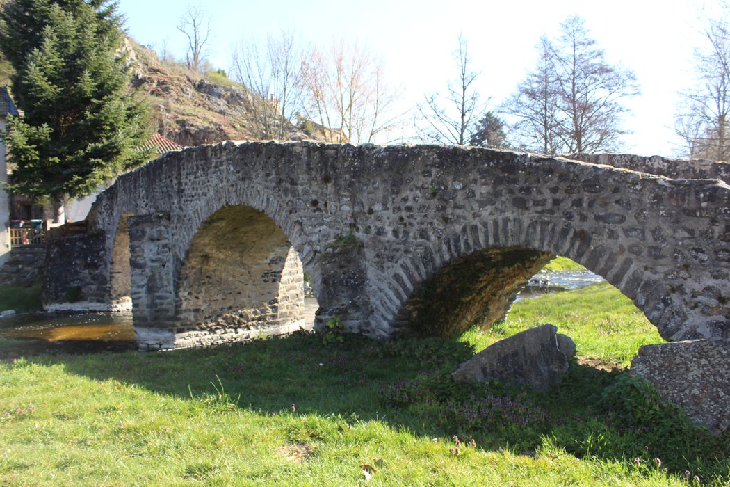 Pont datant probablement du 15e siècle, composé d'un dos d'âne à quatre arcades, avec éperons côté amont. Le pont mesure 2, 20 mètres entre parapets. Les arches sont de dimensions inégales et celle du milieu s'ouvre jusqu'à 3, 30 mètres au-dessus de la Sénouire. Les piles, protégées d'éperons, sont de puissance inégale. L'ouvrage devait desservir le château, construit à la même époque, et le prieuré-cure. Toutefois, la répétition des mêmes formes pendant des siècles ne permet pas de le dater avec précision. L'ouvrage aurait été restauré en 1850, sans doute après une crue.