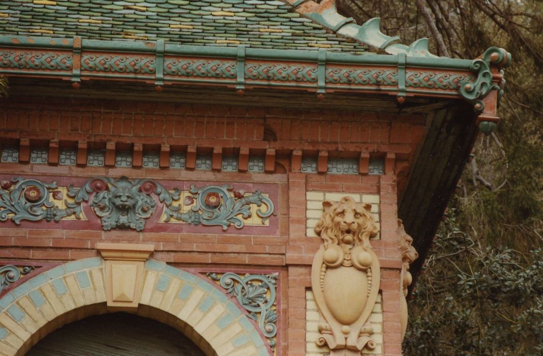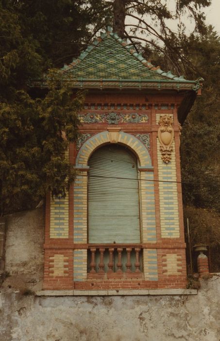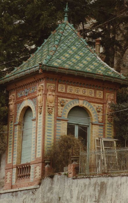 Fabrique de jardin 1900, entièrement polychrome sur ses deux faces. Il s'agit d'un pavillon provenant d'une exposition universelle ou inspiré d'un modèle d'Exposition, témoin de ce type d'architecture souvent destiné à disparaître. De plan carré, cette fabrique de jardin présente un décor polychrome fait de briques émaillées et de terres cuites. La base de la modérature est constituée par une structure de brique naturelle s'ordonnant en deux jambes accostant une arcade centrale. Des chaînes horizontales divisent en élévation le parement en trois registres superposés. Le plein de chaque jambe accostant l'arcature est délimité en table par des briques demi harpées. L'arcade d'une des faces est fermée par une balustrade servant d'appui à une fenêtre. Le jambage de chaque baie est constitué par un appareil de brique ocre clair, présentant sur sa face externe une alternance de briques bleues. Une imposte et une clef saillantes soulignent l'arc plein cintre dégageant des écoinçons ornés. Un deuxième bandeau accosté de têtes de lions en terre cuite délimite un entablement au-dessus de chaque arc. Un bandeau d'architrave surmonte chaque arcade, accosté de deux petites tables situées à l'aplomb des jambes. Le toit en pavillon à égoûts retroussés présente une bordure de rive et des antéfixes angulaires rechampis de bleu. Chaque versant est orné de tuiles en écailles émaillées formant un quadrillage de losanges dont le centre est souligné de jaune.