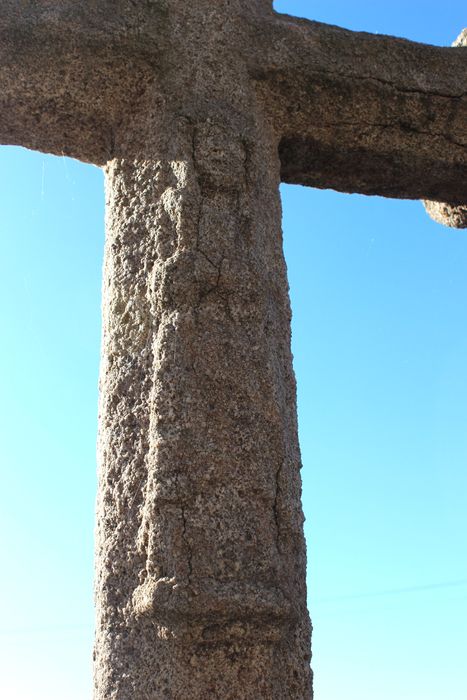 Croix du 15e siècle qui devait primitivement être supportée par un fût disparu. La croix est de section hexagonale. Les croisillons sont terminés par des ornements à fleurons isolés par une astragale. Sur la face antérieure est sculpté le Christ surmonté d'un lambe. Sur la face postérieure est sans doute sculptée la Vierge, les mains jointes, la tête inclinée, portant des vêtements aux plis droits et rigides. Un commencement de chapiteau, attenant à la croix, se voit au bas.