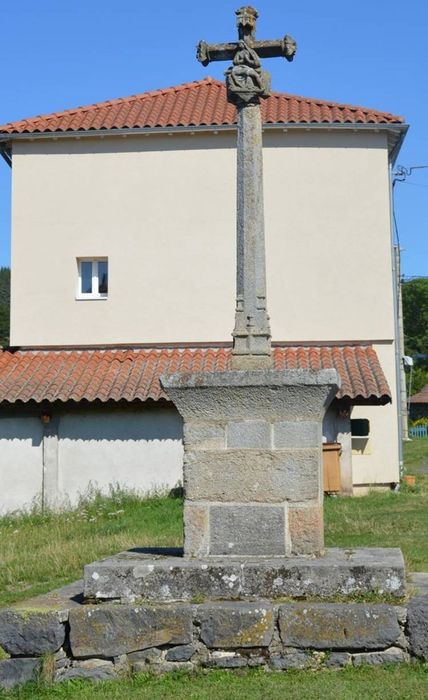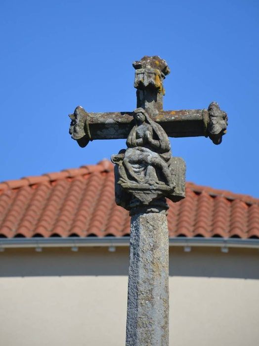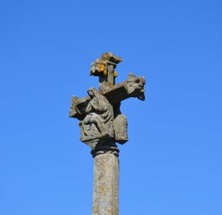 Croix ornée de fleurons à ses extrémités. Sur la face antérieure, le Christ surmonté d'un lambel ; sur la face postérieure, la Vierge sous un dais. De chaque côté deux petits personnages : Saint-Jean et Madeleine ; le personnage de gauche est décapité. Le fût gothique est de la même époque que la croix.