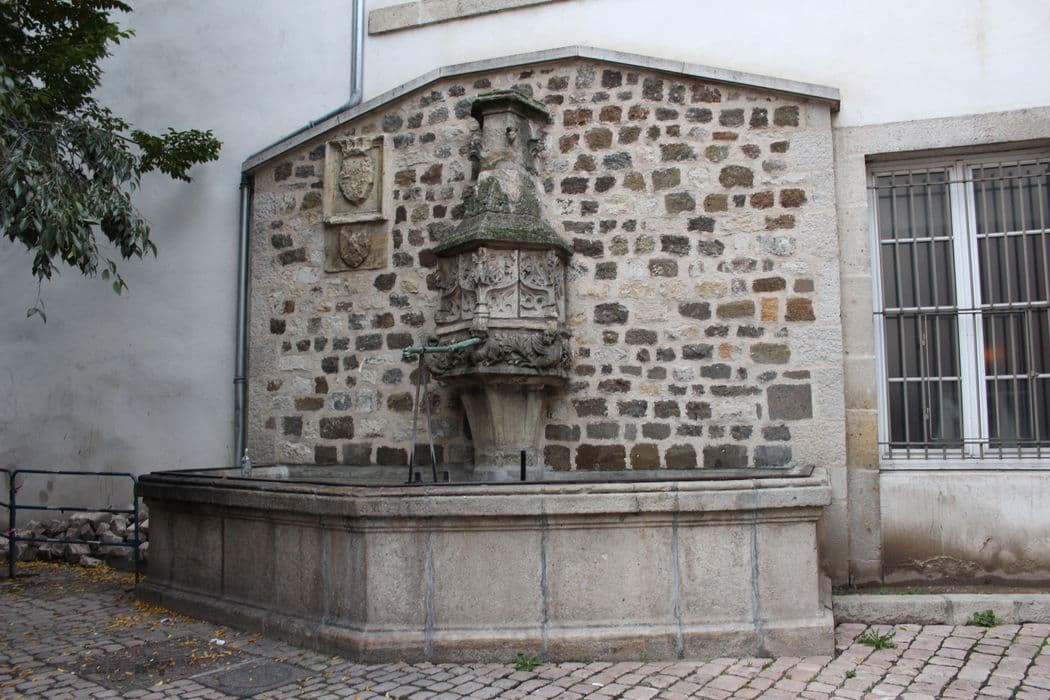 Fontaine de la fin du 15e siècle, en grès de Blavozy, adossée au mur pignon d'une maison qui porte, en outre, deux écussons, l'un aux armes du Puy (aigle aux ailes déployées) , l'autre aux armes de France.