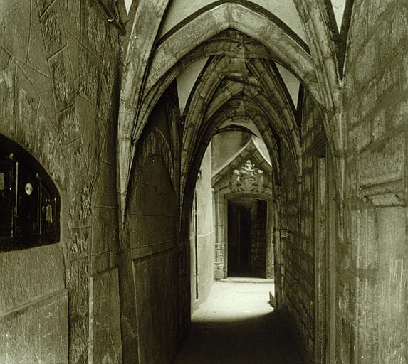Escalier à vis : 16e siècle. Hôtel : 16e siècle, 18e siècle. Ce logis résulte de la transformation, dans la seconde moitié du 18e siècle, d'une hôtellerie médiévale (mentionnée dès 1408) destinée aux pélerins et qui eut comme hôtes les rois de France, de Sicile et d'Aragon. La partie la plus intéressante est la cour intérieure du 15e siècle, ses galeries et l'escalier à vis qui la dessert. Son décor flamboyant, lourdement orné au 19e siècle de peintures et menuiseries qui lui confèrent un style troubadour, montre des figures sculptées d'une remarquable qualité (figure triste, figure gaie, triple face...). Le décor tourmenté des arcatures est typiquement ponot. Les parties hautes de la cour (second étage) ont sans doute été modifiées à la suite d'un incendie qui a ravagé l'immeuble.