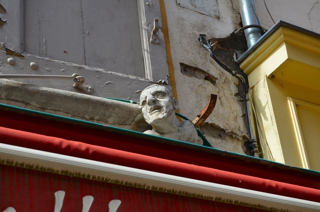 Maison du 16e siècle avec, au rez-de-chaussée, une ancienne boutique de style gothique à arcs surbaissés. Au premier étage, les fenêtres reposent sur une moulure ornée aux deux extrémités de bustes dont l'un représente un fou, l'autre un vieillard.