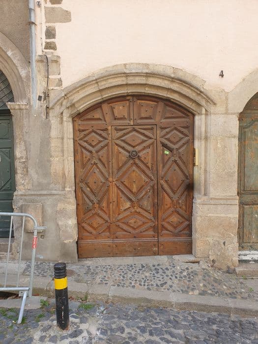 Avant les remaniements subis par la rue du Cardinal de Polignac, lors de l'agrandissement des jardins de l'évêché, une maison se trouvait à l'extrémité. Des sculptures de la fin du 15e siècle, écussons et niches encadrées de débris de colonnettes prismatiques en provenant, ont été recueillis. La porte proviendrait de cette maison détruite. Il s'agit d'une porte cintrée, à bossages, impostes, et clef en saillie. Menuiserie d'époque à petits panneaux et pointes de diamant qui rappelleraient la fin du 16e ou le début du 17e siècle.