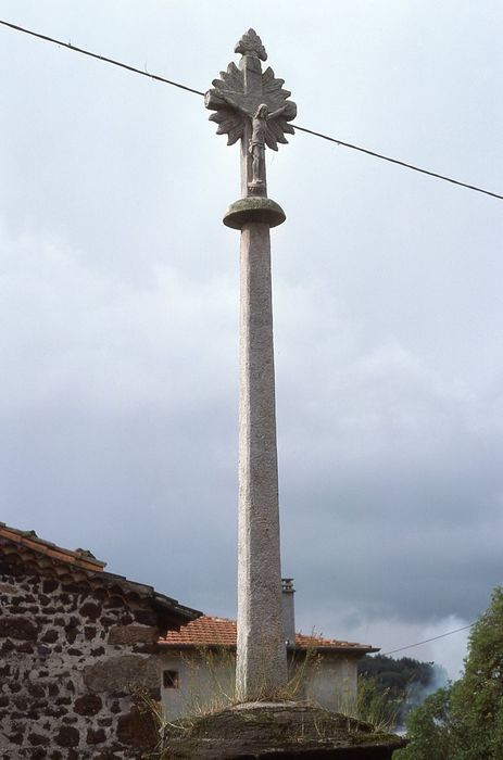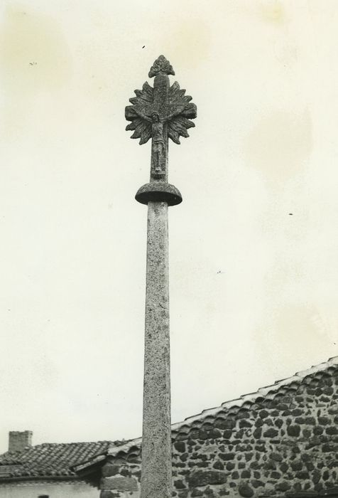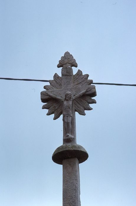 La croix n'est pas antérieure au 18e siècle et remonte même peut-être au début du 19e. Le socle carré représente plus d'un tiers de la hauteur totale. Le fût, légèrement conique, porte le sommet du croisillon. Un chapiteau semi hémisphérique formant liaison entre fût et croisillon, est gravé d'une série continue de palmettes. Le croisillon de section carrée portait, à chacune de ses extrémités, une palmette du même type que celle qui a été replacée récemment au sommet. La liaison des pièces devait se faire par emboîtement. Entre chaque bras du croisillon, une série de trois flammes donne à l'ensemble forme circulaire. Un Christ aux bras étendus et aux jambes droites est représenté en haut relief.