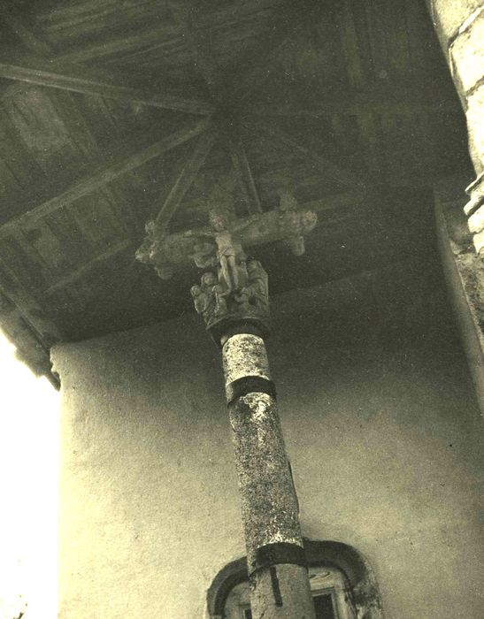 Croix abritée par un auvent à charpente que supportent un mur plein, un pilier partant de terre, et un autre d'une sorte de mur d'appui en loggia. Les piliers, dont le plus important comporte un bénitier, sont prismatiques. Le Christ est entouré de deux anges. En adoration à ses pieds, les Saintes Femmes. La Vierge est soutenue par un personnage à la chevelure abondante. Au revers, Vierge à l'Enfant, dont la robe est soutenue par des anges.