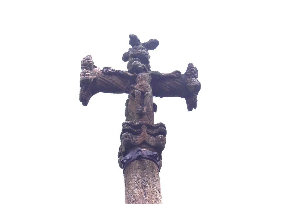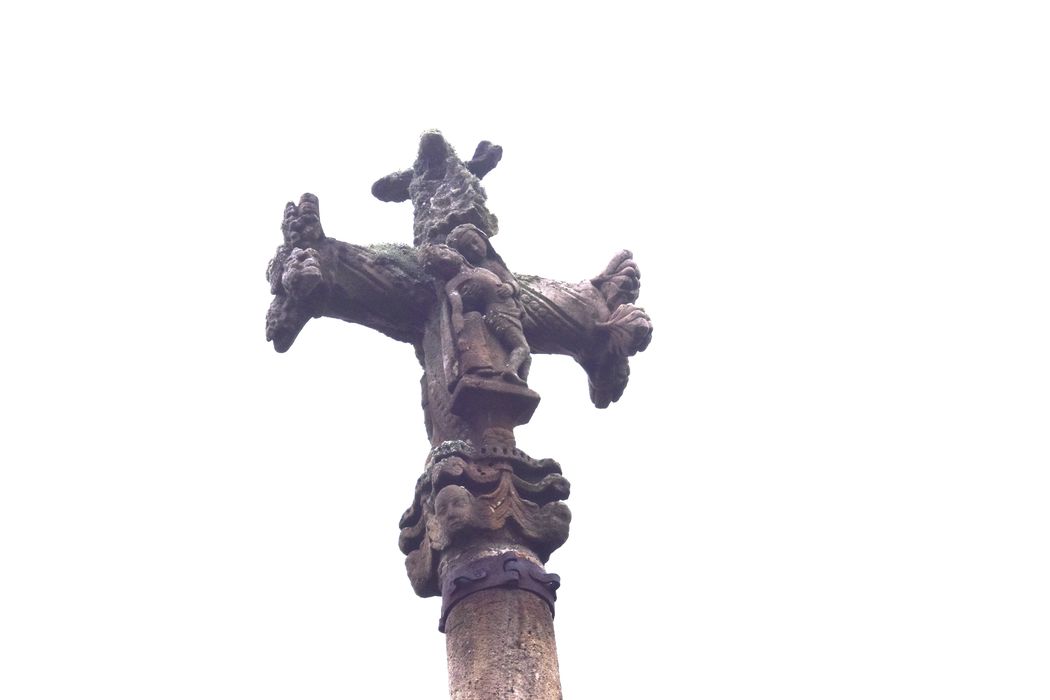 Edicule de la fin du 15e siècle ou du début de la Renaissance. La croix se compose d'un grand fût cylindrique avec base et chapiteau surmonté de la croix proprement dite. Cette dernière partie porte, sur une face, le Christ, et sur l'autre une Vierge de Pitié debout, le Christ entre ses bras. Les branches de la croix sont torsadées avec des cours de perles et terminées par des fleurons cruciformes.