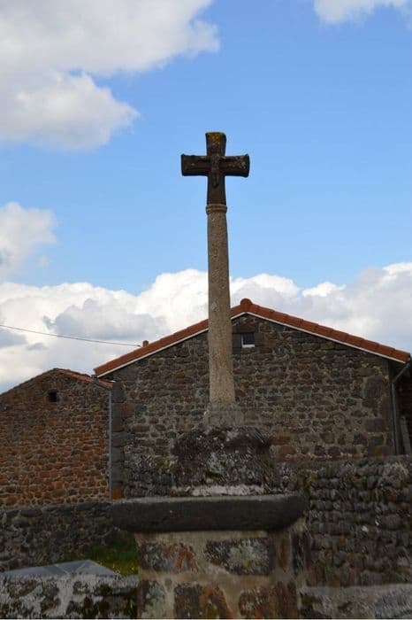 Cette croix en lave volcanique rouge est à section quadrangulaire et les croisillons ornés d'une double rainure s'évasent à leur extrémité en forme de croix de Malte. Une statuette du Christ est placée sur la face antérieure. Rien sur la face postérieure. Le fût est cylindrique, orné de moulures aux deux extrémités et repose sur une base tronconique portant la date 1772.