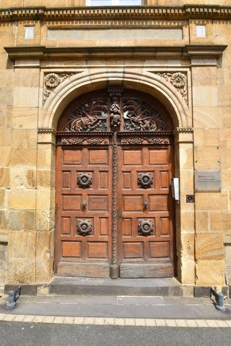 Exemple de menuiserie du 16e siècle, la porte est constituée de deux vantaux comprenant chacun six panneaux, avec rosaces sculptées, et imposte à cintre surbaissé sculptée à jour de guirlandes et motifs de fruits.