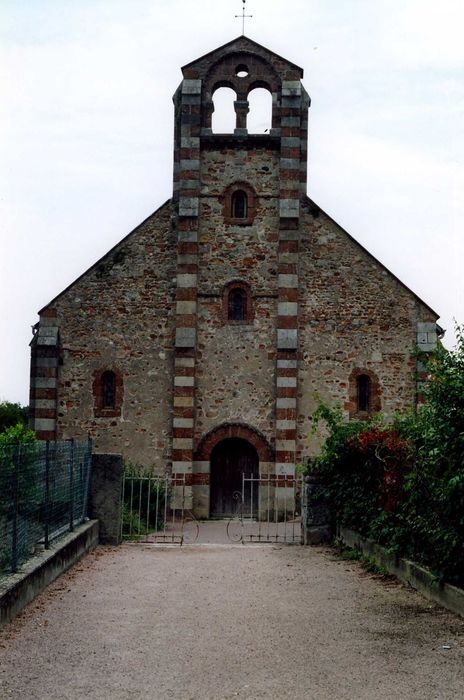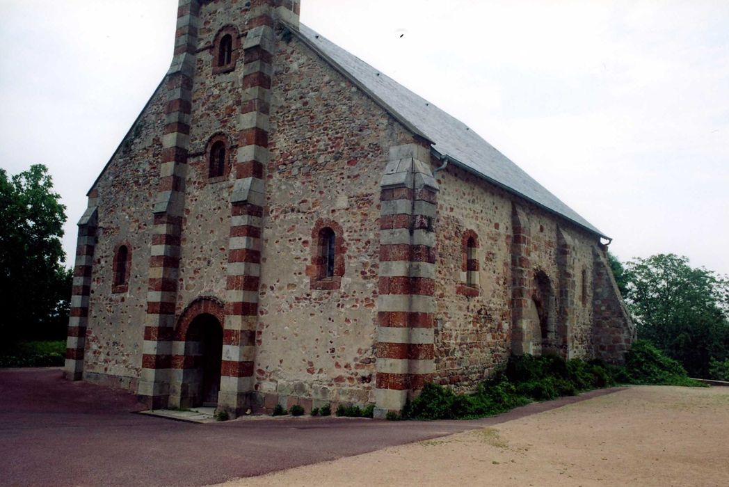 Ancienne chapelle seigneuriale du château du Breuil. Edifice à une nef et deux collatéraux de trois travées, une abside et deux absidioles. Les maçonneries et les colonnes semblent dater du milieu du 12e siècle. La disposition des chapiteaux de l'absidiole centrale indique que le plan primitif prévoyait une nef couverte de voûtes. La façade ouest a été presque entièrement reconstruite, du moins les parements extérieurs composés d'assises alternées de pierres blanches et rouges. Sans clocher, les cloches étaient suspendues dans de simples arcades surmontant le pignon. Le tombeau d'une dame du Breuil, datant du 14e siècle, est placé dans une petite chapelle. Autrefois enfoui dans le sol, le monument a été remonté au début du 20e siècle.