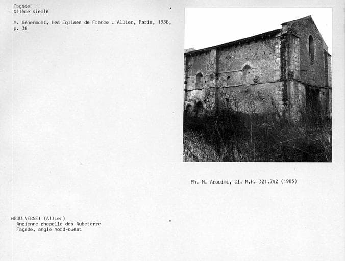Ancienne chapelle du prieuré Sainte Pétronille d'Aubeterre, datant du 12e siècle, dont les bâtiments conventuels ont disparu. Petit sanctuaire à nef unique se terminant par une abside, voûtée en berceau et éclairée par des fenêtres en plein cintre. A l'extérieur, corniche romane. Deux enfeux, un à l'extérieur, l'autre à l'intérieur, possèdent des chapiteaux. Peintures murales du début du 13e siècle. Sur le mur nord, sainte Catherine et deux donateurs ainsi que deux représentations féminines (la Foi et l'Eglise ?) ; sous un enfeu en plein cintre, représentation d'une Vierge à l'Enfant. Sur le mur sud, le baptème du Christ, la Flagellation et une Déposition de croix. Chapelle vendue comme bien national en 1791, puis transformée en grange. Chapelle témoin de la vie monastique du Moyen-Age en Bourbonnais.