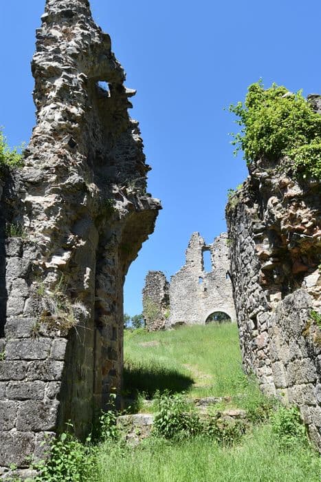 Edifice trapézoïdal du 13e siècle, flanqué aux quatre angles de tours rondes et dont chaque grand côté est défendu par un donjon carré. L'édifice a été bâti à l'emplacement d'un ancien castrum (découverte de bronzes gallo-romains en 1867). Il représente peut-être la doyenne des forteresses féodales de la région.