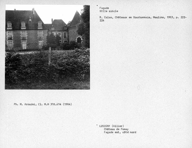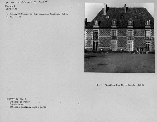 Au 15e siècle, Pomay dû être un domaine conquis sur la forêt. Accès à la demeure Louis XIII par une longue avenue dont le portail est fermé par une ferronnerie du 18e. Une première cour est bordée au nord et au sud par les communs. Un large mur bahut la sépare de la cour d'honneur encadrée par deux tours de briques terminées par des campaniles octogonaux. Dans le fond, le château se compose d'un corps central à rez-de-chaussée et premier étage, encadré de deux pavillons.