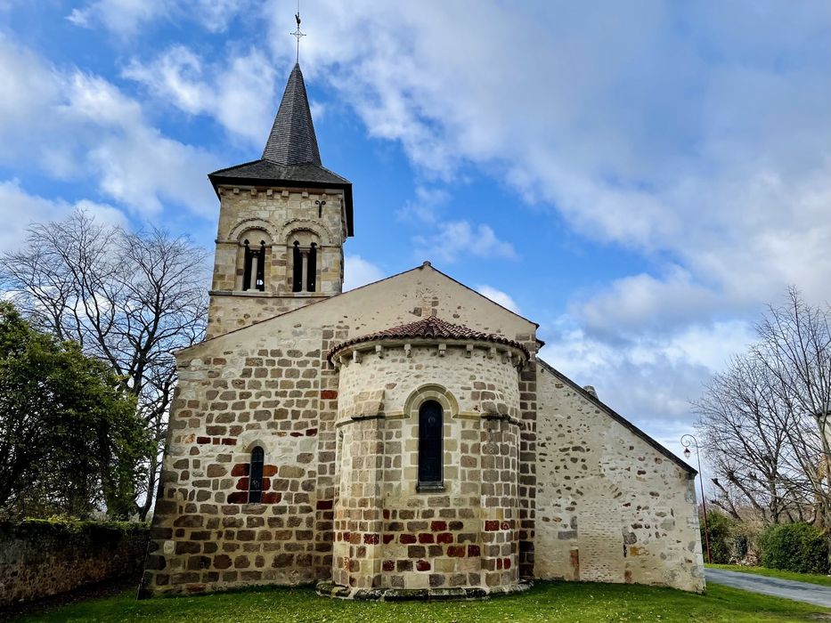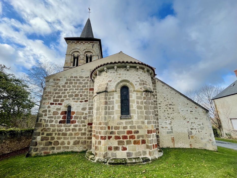 Possession ancienne de l'abbaye de Saint-Denis à laquelle elle fut restituée une première fois en 802 par Charlemagne, une seconde fois au 11e siècle pour faire partie du patrimoine du prieuré de la Chapelaude. Au 16e siècle, passe parmi les dépendances du prieuré de Benevent, en Limousin. Edifice roman composé primitivement d'une seule nef de deux travées et d'un trnsept saillant sur lequel ouvrait un choeur précédant une abside en hémicycle, flanquée d'un clocher. Les collatéraux datent de l'époque moderne. La nef est actuellement terminée par une charpente, mais primitivement, par une voûte sur doubleaux reposant sur les colonnes encore en place dans les murs latéraux. Le clocher carré est percé sur chaque face de son étage de deux baies en plein cintre, recoupées chacune par une colonnette et surmontées d'un double cordon de billettes. La partie supérieure, couronnée d'une flèche, remonte au 17e siècle.