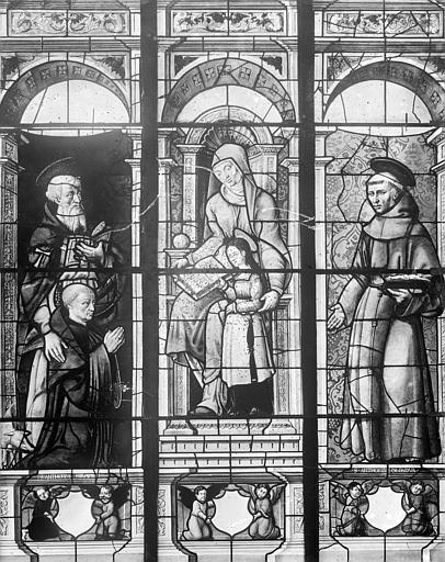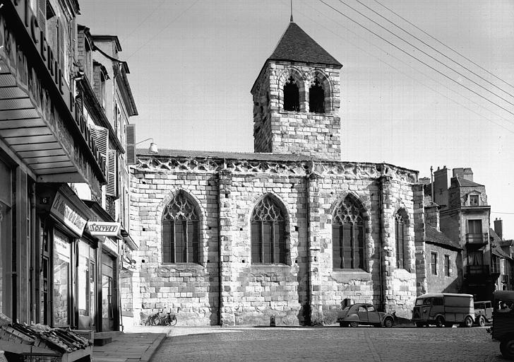 Édifice d’origine romane (fin 11e-12e siècle), dont la reconstruction a été engagée autour de 1400 à l’initiative du duc Louis II de Bourbon et s’est achevée autour de 1510 (une cloche a été fondue en 1511). L’absidiole nord (chapelle Saint-Éloi) et le croisillon nord du transept, deux murs du chœur et les piles nord de la nef datent du 12e siècle. L’édifice gothique, au plan irrégulier et contrarié, se compose de deux vaisseaux, le bas-côté nord n’ayant pas été reconstruit, mais percé de quatre étroites chapelles à baies gothiques moulurées à la fin du 15e siècle. Trois campagnes de travaux peuvent être distinguées. Les bases des piles de la croisée du transept et l’abside de la chapelle de la Vierge furent élevées à la fin du 14e et au début du 15e siècle. Les travaux se poursuivirent lentement vers l’ouest. Une deuxième campagne de travaux fut conduite à partir de 1450 environ : les armoiries des ducs de Bourbon et du prieur Gilles Duboix, à l’extrados des arcs de la croisée du transept, et aux clefs de voûte du chœur et de la sacristie, en témoignent. L’abside à chevet plat et son remplage flamboyant ont été élevés dans cette période. Le clocher, de plan carré, percé de chaque côté d’une baie trilobée encadrée de moulures toriques, fut élevé sur la croisée du chœur, moins haut que prévu initialement. Il était couvert d’ardoises, tandis que la couverture de la nef était en tuiles canal (prix-fait de 1647). Une troisième campagne, vers la fin du 15e siècle, a vu l’érection des travées centrales de la nef et des chapelles nord, mais ce n’est que dans la première décennie du 16e siècle que fut achevée la travée occidentale, avec un pan coupé au sud. Une balustrade animée de quadrilobes, jadis scandée de pinacles à crochets et jalonnée de gargouilles, courait au sommet des murs gouttereaux. Les portails des façades ouest et du pan coupé sud ont été reconstruits en 1622, avec pilastres et frontons à niche. La chapelle du Rosaire, sur le bas-côté nord, a été refondée et agrandie autour de 1611. La chapelle du Sacré-Cœur (ancienne salle capitulaire du prieuré Notre-Dame au Moyen Âge, devenue vicairie Sainte-Madeleine au 16e siècle), au nord du transept, a été réunie à l’église lors de sa reconstruction en 1660. [J.-H.-M. Clément, Montluçon et ses richesses d’art, Montluçon, 1932, p. 338-369. − P. Pradel, « Montluçon. Église Notre-Dame », dans Congrès archéologique de France, CIe session, Allier, 1938, Paris, 1939, p. 25-32 (chronologie de construction rectifiée). – A. Courtillé, Auvergne, Bourbonnais, Velay gothiques. Les édifices religieux, Paris, 2002, p. 307-311. – S. Liegard (dir.), Le prieuré Notre-Dame de Montluçon. Archéologie d’un site millénaire, Revue d’Auvergne, nos 622-623, 2018]
