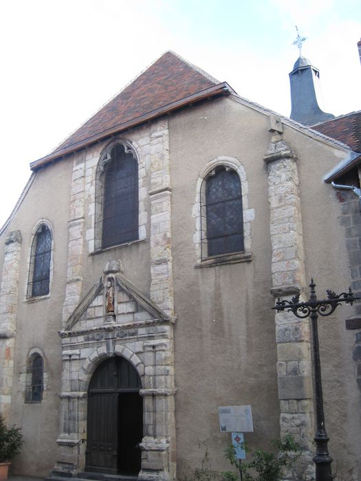 Façade occidentale reconstruite en 1638 (millésime) avec portail sculpté, formé de deux doubles pilastres surmontés d’un fronton triangulaire à niche à statue. Clocher de plan carré à la base romane, surélevé autour de 1640 d’un niveau à arcades (beffroi), couronné par un bulbe en charpente couvert d’ardoises. À l’intérieur, sanctuaire de plan bénédictin datant pour l’essentiel de l’époque romane (12e siècle) ; La nef est couverte d’une charpente apparente du 16e siècle. Les quatre piliers de la croisée du transept, qui soutiennent le clocher, ont été renforcés dès le 13e siècle, d’où leur forme cylindrique. L’un d’eux, dégagé lors de la restauration de 1960, montre un plan cruciforme. L’abside communique avec les absidioles par des chapelles de plan rectangulaire aménagées au 15e siècle. Les bras du transept et le chœur sont voûtés en berceau ; l’abside et les absidioles en cul-de-four ; la croisée du transept est coiffée d’une coupole sur trompes. La chapelle de la Vierge (Saint-Sébastien au 17e siècle), au nord de la nef, a été reconstruite en 1641. La chapelle de la Bonne-Mort, attenante au bras sud du transept, date du 15e siècle. [J.-H.-M. Clément, Montluçon et ses richesses d’art, Montluçon, 1932, p. 370-391. − P. Pradel et M. Génermont, Les églises de France. Allier, Paris, 1938, p. 161-162]