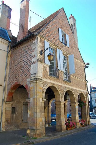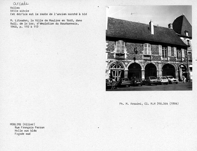 Reste de l'ancien marché à blé, bâti selon la tradition par Mansart. L'édifice comprend trois arcades sur la rue François Péron, et cinq sur la rue Diderot. Ce bâtiment est un exemple de la construction en briques et pierres, caractéristique de l'architecture moulinoise du 17e siècle.