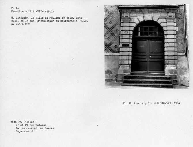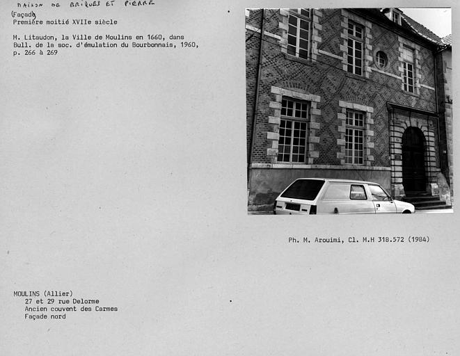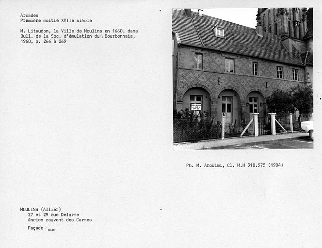 Ensemble d'éléments construits du 16e au 18e siècle. Le couvent a été fondé en 1350 à l'emplacement d'une chapelle dédiée à Notre-Dame de Pitié. Aux deux extrémités de l'église saint-Pierre s'appuient les corps de logis limitant l'ancien préau sur lequel s'ouvrait le cloître. Un ensemble de baies ouvre sur le préau, en plein cintre avec clef en saillie, moulurées sous un larmier. Leurs retombées se font sur des piliers cubiques à chapiteaux doriques. Chacune de ces baies est construite en briques, offrant une polychromie obtenue par des briques noires formant losanges. Une corniche de briques, formée de quatre plate-bandes superposées en saillie, couronne chacune des façades sur le préau. La façade rue Delorme s'ouvre par un portail monumental au seuil surélevé de trois marches. L'arc en plein cintre, à clef de voûte en saillie, est appareillé en bossages, ainsi que les piedroits contre lesquels sont engagés des pilastres supportant, par des chapiteaux ioniques, un entablement décoré d'un triglyphe sur rangée de gouttes. De part et d'autre de cette façade allongée au midi fait saillie une aile ou pavillon. L'aile est, qui est dans le prolongement du choeur et de l'étage surmontant ce dernier, est plus élevée d'un étage que le corps de logis à l'extrémité duquel elle fait saillie.