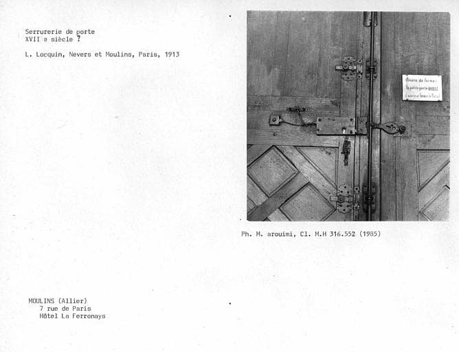 Hôtel du 17e siècle, mentionné dès le 15e siècle, composé autour d'une cour rectangulaire que ferme l'aile basse des communs. Les trois façades sur cour sont en briques noires et rouges, et en pierre, caractéristique de l'architecture civile moulinoise de cette époque. Passage voûté en anse de panier menant sur la rue. A l'intérieur, une rampe en fer forgé borde un escalier à huit volées droites desservant les étages. Chaque panneau de la rampe est rectangulaire, de composition symétrique, formé de motifs courbes affrontés. La façade de l'hôtel est un bon exemple d'architecture civile du début du 17e siècle. La porte a gardé sa boiserie ancienne ornée de sculptures. Le grand balcon qui souligne l'architecture du rez-de-chaussée est porté sur deux consoles de pierre ; des grilles en fer forgé forment balcon aux fenêtres.