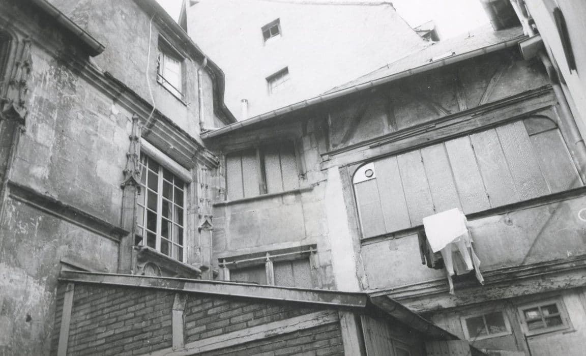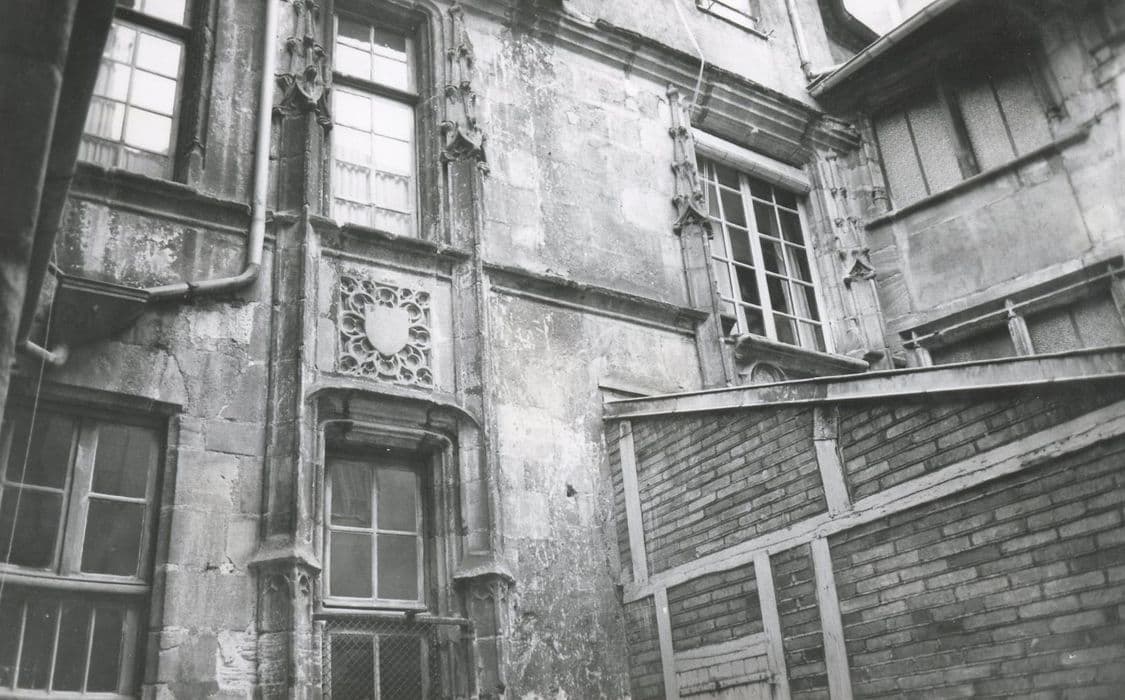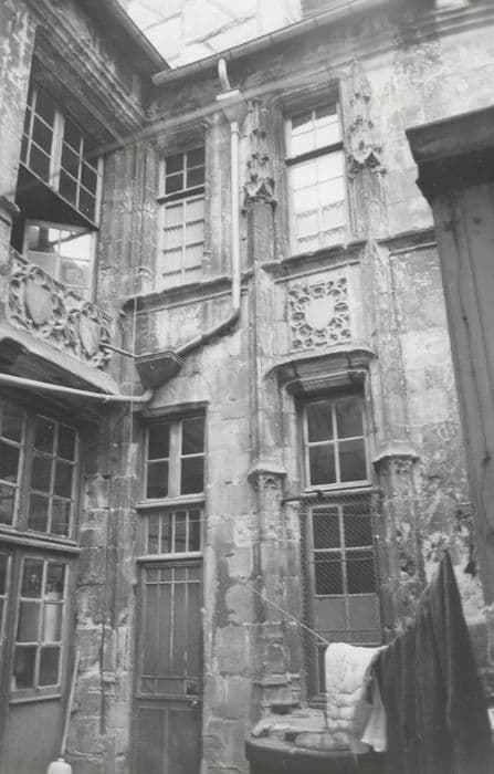 Maison du 15e siècle dont trois façades sur la cour intérieure présentent un décor de style flamboyant. L'encadrement d'une des fenêtres est mouluré d'un tore dégagé par des cavets et posé sur bases prismatiques. De part et d'autre des montants s'élèvent des pilastres triangulaires interrompus aux 2/3 de leur hauteur par un larmier en saillie au-dessus de deux arcs tréflés. Au-dessus du linteau, un cordon en larmier, arrondi à ses extrémités, joint de part et d'autre ces pilastres qui se continuent vers le haut. La seconde fenêtre possède le même décor. Les linteaux de ces deux fenêtres sont surmontés d'un panneau sculpté en bas-relief à l'intérieur d'un cadre de moulures formé par les pilastres sur les côtés et par le cordon d'appui de l'étage à la partie supérieure. Une seconde façade présente, sur la partie comprise entre une fenêtre et la porte, deux écus sculptés dont chacun est placé au centre d'un quatrelobe dont chaque lobe inscrit un arc tréflé. Une troisième façade présente également des éléments sculptés intéressants. A la suite de cette partie construite en pierre s'étend, à l'étage, une galerie dont l'ossature est à pans de bois, portée sur une sablière décorée à sa partie supérieure d'un cordon mouluré.